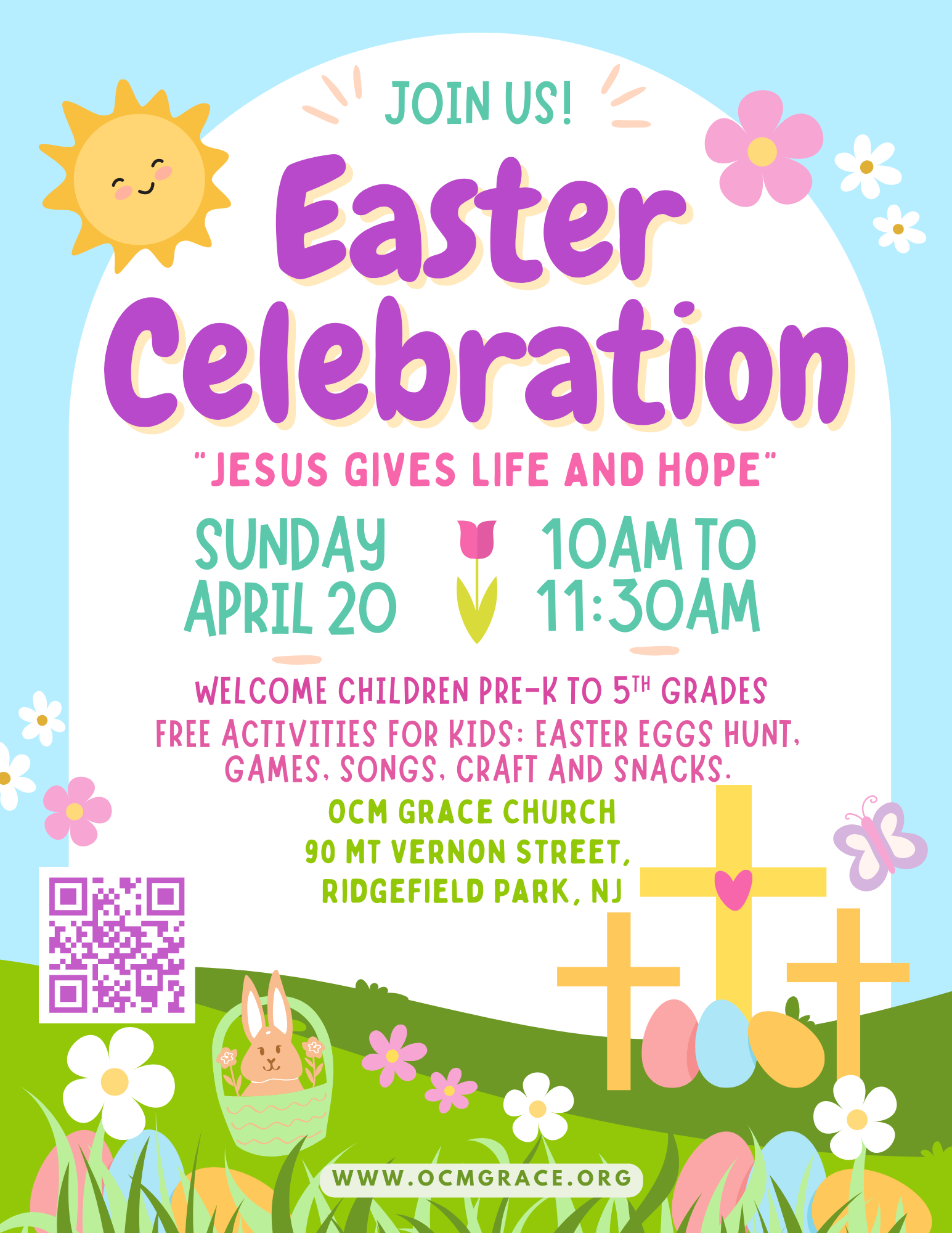 Hi everyone! Join us at the OCM Grace Church – Easter Celebration with Egg Hunt, filled with games and fun for the whole community!