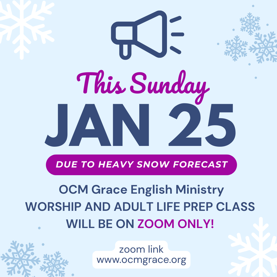 🌨️OCM Grace English Ministry's Worship service and Adult Life Prep class will be held on ZOOM ONLY.