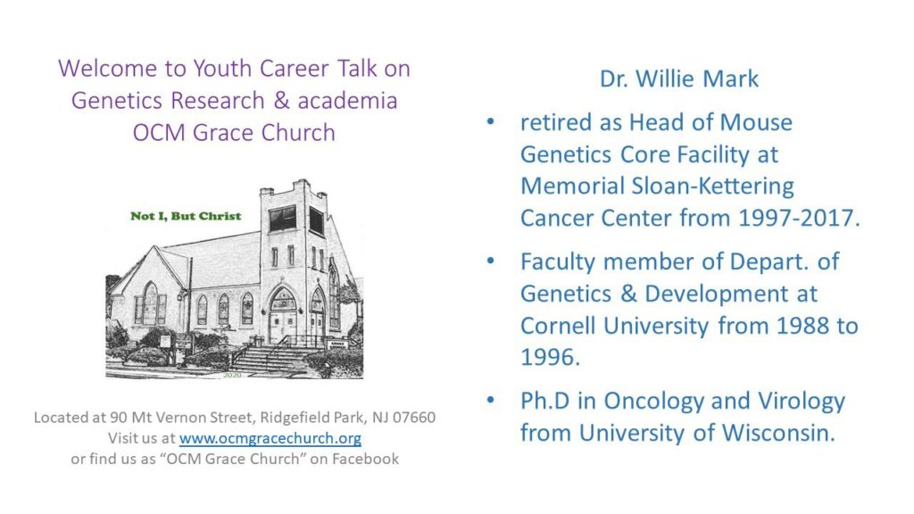 EM, Events Youth Career Talk – Genetics Research & Academia August 27, 2020 August 29, 2020 Dr. Willie Mark shared his experience from a career in Genetics Research and academia, including his insights on COVID 19, with career and college searching youth in grade 10 and higher. Career Talk Video video password: Cv7#8*k! New Executive Board members 2020 Mid-Autumn Evangelical Meeting 2020