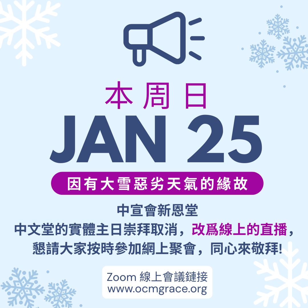 🌨️因有大雪惡劣天氣的緣故,本周日(1/25/2026)中文堂的實體主日崇拜取消,改爲線上的直播,懇請大家按時參加網上聚會,同心來敬拜