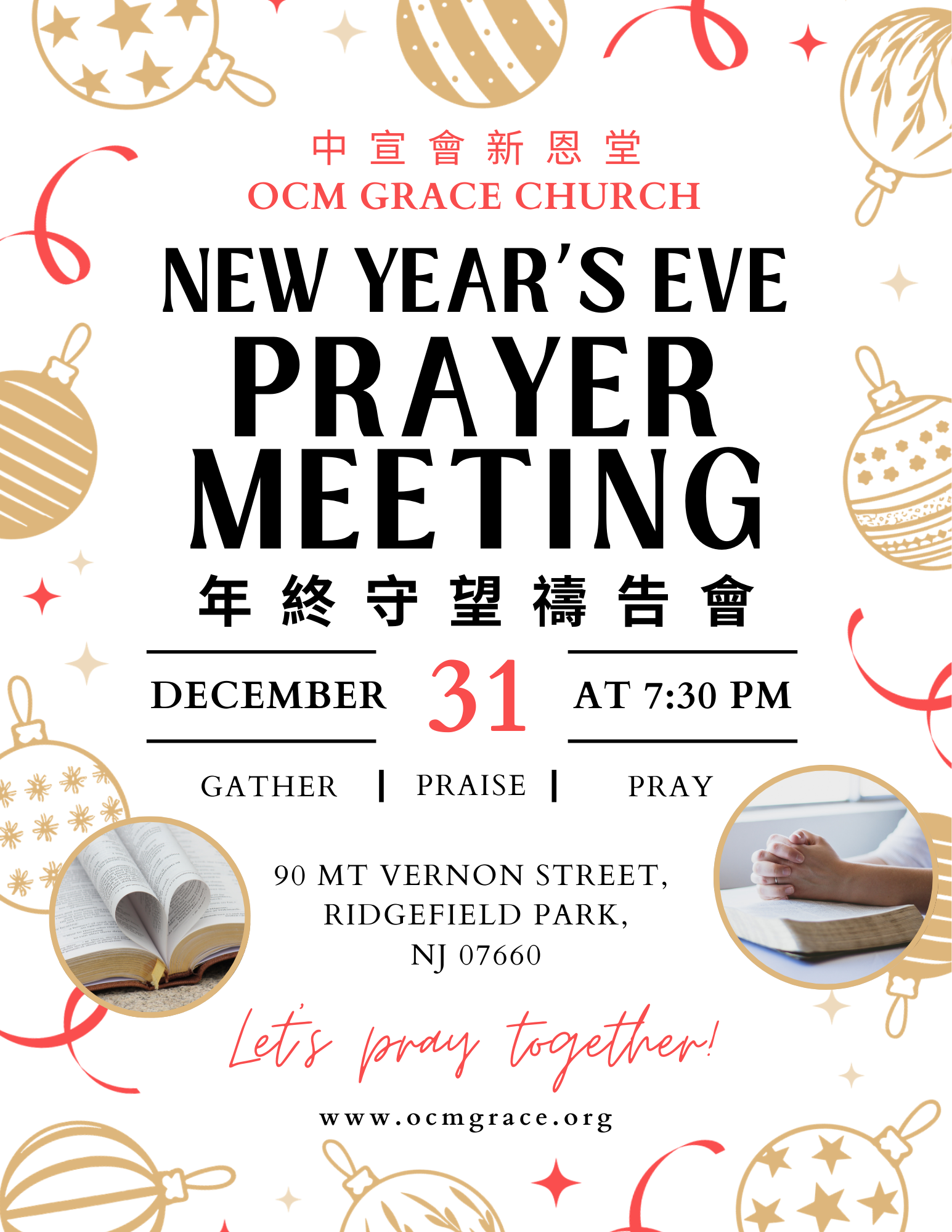 FrontPage, 中文, 活動 2025 年終守望禱告會 28 12 月, 2025 28 12 月, 2025 年終守望禱告會 December 31, 2025 7:30PM 讓我們一同祈禱迎接新年! 因為上帝愛世人,甚至將祂獨一的兒子賜給他們,叫一切信祂的人不致滅亡,反得永生。約翰福音 3:16 2025 聖誕燭光崇拜