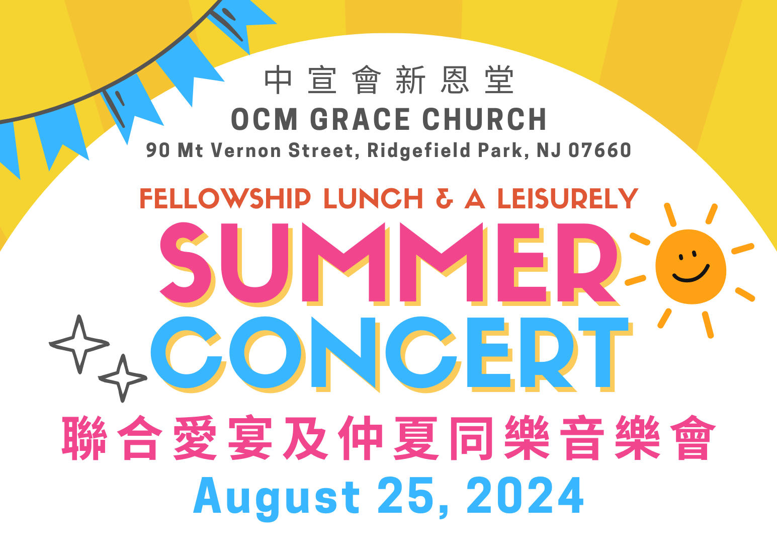 2024 新恩堂仲夏同樂音樂會 聯合愛宴及仲夏同樂音樂會 8月25日中文崇拜後,一家一菜共進午餐。 同樂音樂會於兩點鐘開始。 由新恩堂會友和會外朋友提供節目。 敬邀參加,同享主内情誼! + Add to Google Calendar + iCal / Outlook export Date 8 月 25 2024 Expired! Time 1:00 pm Share this event Events Gallery